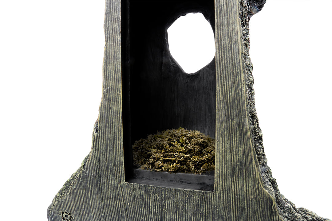 Deze functionele terrariumdecoratie van Terra Della is geschikt voor tal van boombewonende amfibieën en reptielen zoals gekko's, hagedissen, slangen, … Het is een perfecte schuil- en broed en nestplaats met hoger gelegen ingang. De handige schuifdeur in 2 delen achteraan laat controle toe en zorgt voor een gemakkelijke reiniging. De 2 holtes bovenaan kunnen gebruikt worden om voeder- en drinkbakjes in te plaatsen.